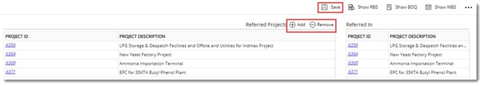 Listed in the Reference tab are two sets of reference details where the first one is a list of Other Projects referenced by the current Project. The second is a list of other Projects to which the current Project is referred.