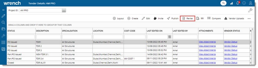 Published tenders may be revised when any major changes are to be made. Only users with ‘Revise’ permission will be able to do the operation. Tenders when in ‘Published, ‘Republished’, ‘Closed’, ‘Bid Evaluation’, ‘Recommended’ statuses can be revised. Attempt to revise tenders in other statuses is aborted with an alert message.