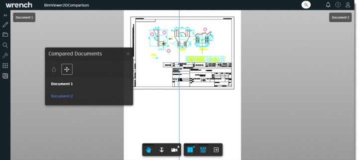 If the option Overlay is selected, the two drawings are displayed as stacked and changes are highlighted through the colour codes. If the option Side by Side is selected, a slider in the form of a vertical line is displayed.