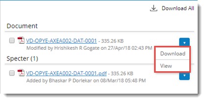 Files pane: The files pane displays the files associated with a revision/version. To view the files associated with a revision, select a revision in the revision-version pane, the file representing the selected revision of the main document and its associated files (Specter, Related File, Comment, Client Comment, Squad Check Comment, Markup, Reference Document, RFI) if any, are displayed in the files pane. You can select the file and download or view the file. These operations can be carried out from a drop-down list.