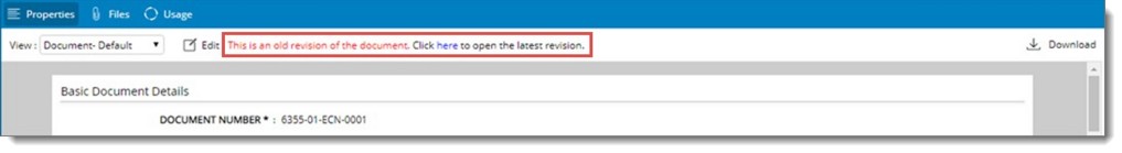 If there are multiple revisions for a document, they are listed under revisions tab. On clicking the document number hyperlink, document details window is opened. If the document hyper link you clicked is that of an old revision document, this is indicated in the document details window. You can open the latest revision of the document by clicking the hyperlink Click here to open the latest revision.