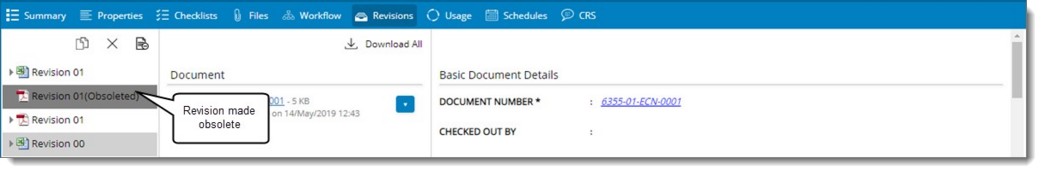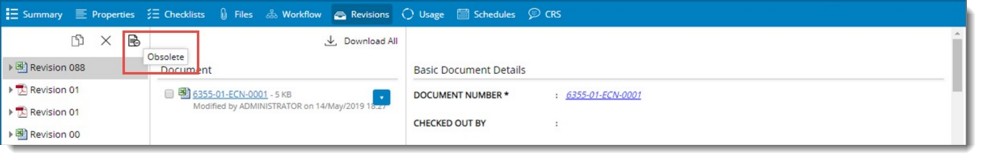 - Select the revision that is to be made obsolete and in the tool bar click Obsolete.