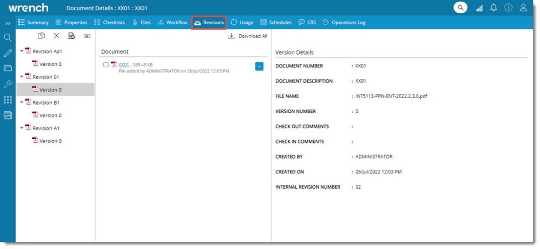 - In the document details window, top navigation bar click Revisions. Revision window is displayed.