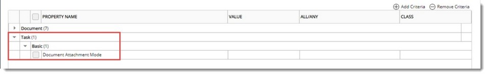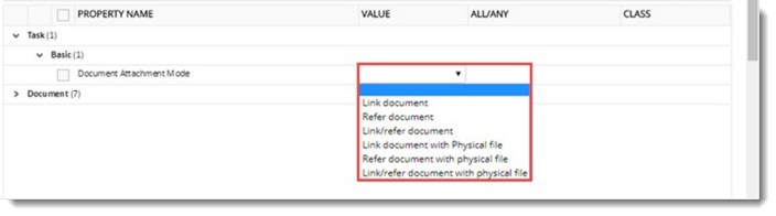 Basic task property available for object type task is displayed in the following figure. Only a single property Document Attachment Mode is available here.