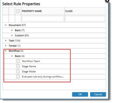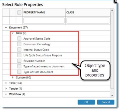 In the rule properties window different objects and object properties that can be added to rules are available. In the preceding figure properties are grouped based on Object Type and Property Type. Basic object properties and custom properties can be selected from this window. Custom Properties defined in the masters for documents and tasks are available here. Different object types and basic properties available under them are mentioned in the following table.