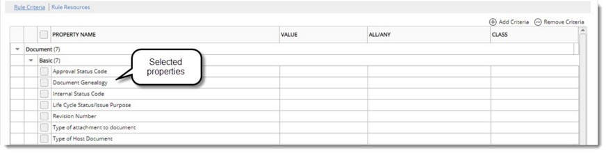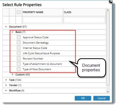 Basic document properties available for object type document is displayed in the following figure. Select the checkbox next to the property that you want to add to the rule.