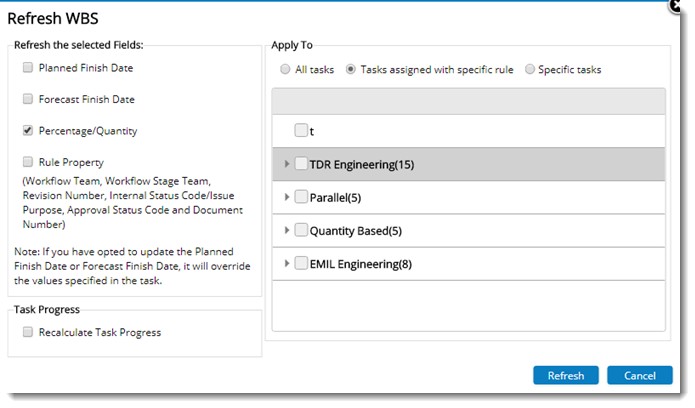 Refresh the selected Fields: Under this group fields Planned Finish Date, Forecast Finish Date, Percentage Quantity and Rule Property is available. If the option Rule Property is selected, on clicking Refresh button, properties Workflow Team. Workflow Stage Team, Revision Number, Internal Status Code, Issue Purpose, Approval Status Code and Document Number are refreshed.