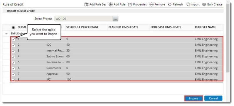 For the Rule set defined we can create rules of credit based on which the progress of deliverables related to the project is monitored.