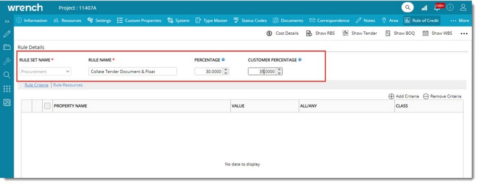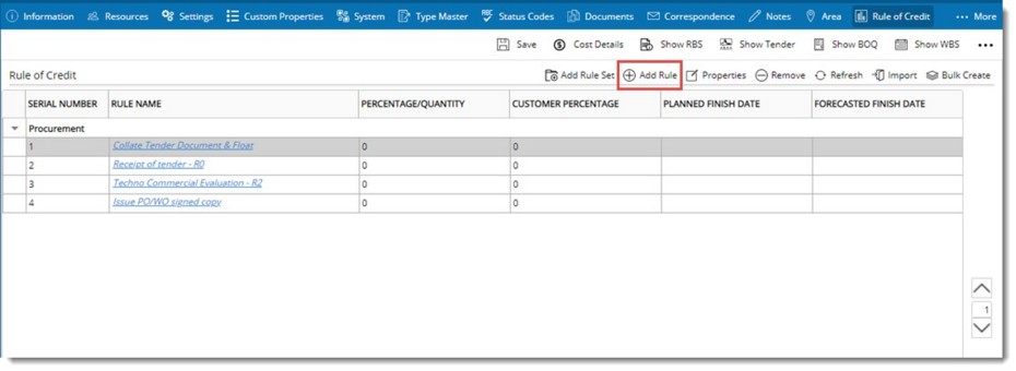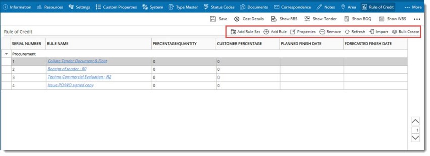 - In the Project Properties window select Rule of Credit tab. Rule of Credit window is displayed.