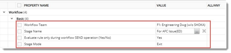 NOTE: If the property Stage Name is removed, properties Stage Mode and Evaluate Rule only during workflow send operation is also removed.
