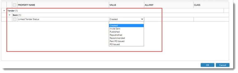For the criterion Linked Tender Status, different values can be selected from a drop-down list.