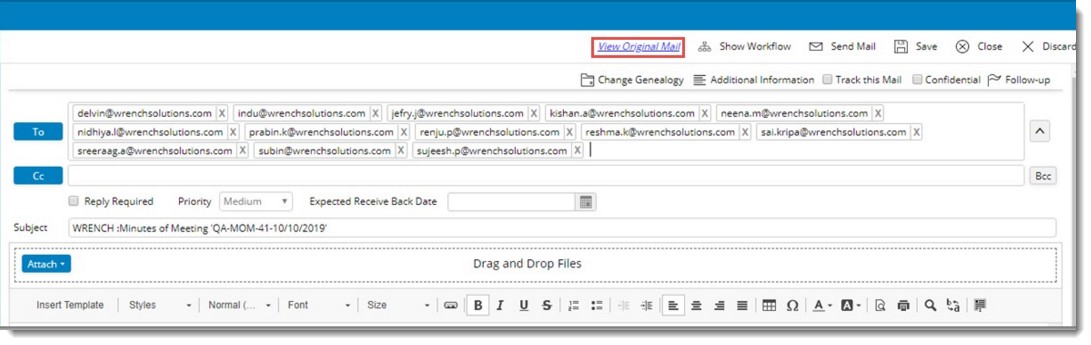 A hyper link View Original Mail will be available in the draft’s correspondence for a fetched mail that is work in progress. This will be available until the mail is send and once the mail is sent, this link is no more displayed.