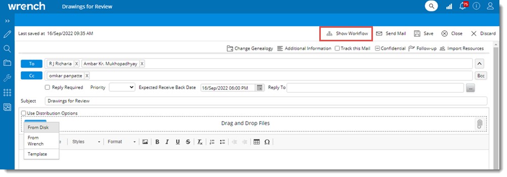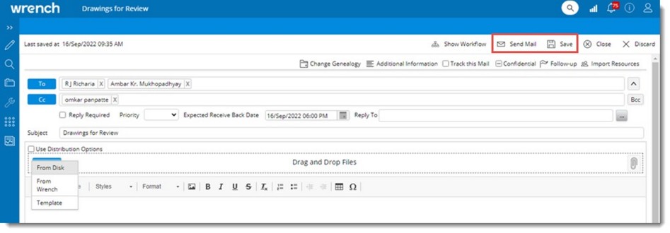 NOTE: In case there is a workflow added to the mail and the workflow is started instead of Send Mail button Send button is displayed.