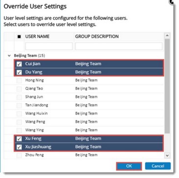 - Select the checkbox next to users to override user level settings and click OK.