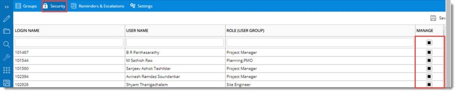Security defined here is applicable to both Users and User Groups (Roles). Only users with security right can manage a snag.