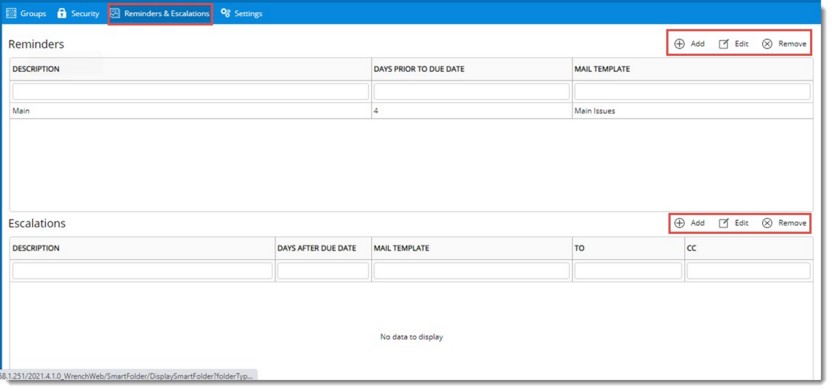 Figure: Reminders and Escalations configuration window