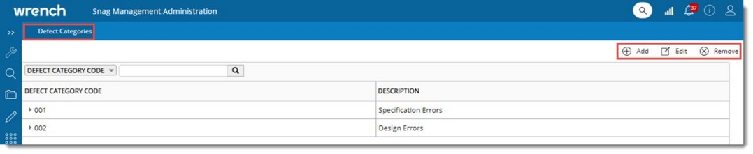 - Select single or multiple defect categories and in the toolbar click Remove.