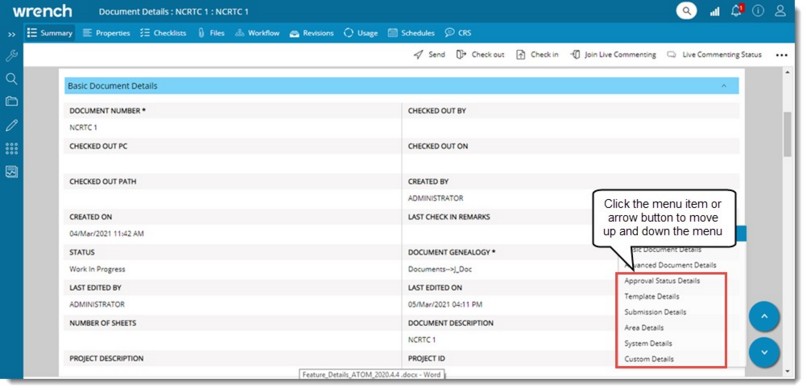 For viewing different document details with ease, a menu is displayed on the bottom right side of the document details window. On clicking an item in the menu the corresponding details are displayed in the grid. Depending on the selection you make document details scroll up or down automatically. In addition an arrow button is provided to move between different sections.