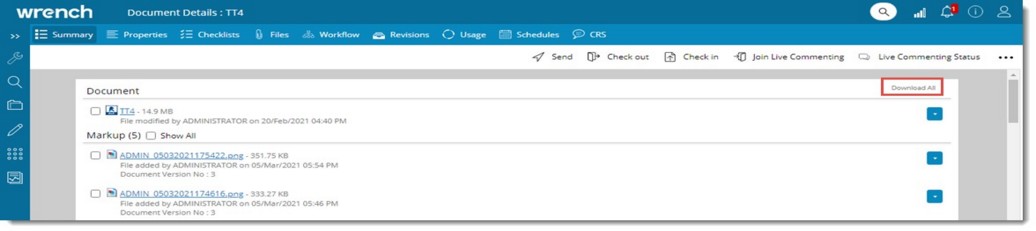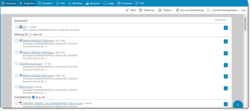 NOTE: When the comments are displayed in the Summary tab, only the comments of the latest version of the main document is displayed. To display comments of all the versions of the latest revision of the main documents select the checkbox next to the option Show All. On selecting the checkbox next to this option, comments of all versions of the latest revision is displayed.