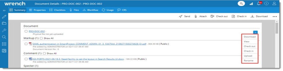 Download, View, Show Details, Check Out, Check In, Replace, Delete, Detach, Rename. After selecting the document on clicking Delete from the menu, a warning message is displayed. Click OK to remove the document from all associated documents and WRENCH. After selecting the document on clicking Detach from the menu, a warning message Do you want to detach the selected file is displayed. |