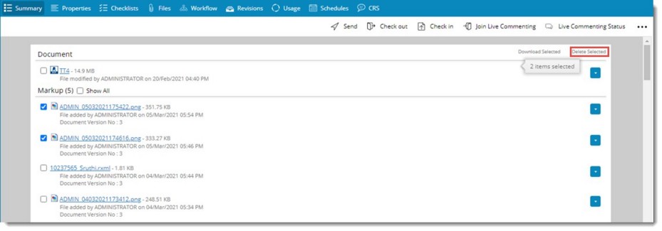 There are scenarios where users will upload all additional supporting documents as Related Files. After reviewing, if some of the uploaded files are to be removed, removing the files one by one is a tedious task. Hence an option to remove multiple files will be available in Summary tab and Files tab of the document details window.