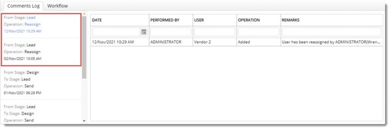 On clicking Comments Log tab, log of workflow operations when workflows are sent from one stage to another is displayed. The list of recipients to which the workflow was sent is also listed in the window. Log of reassign operation is displayed separately as shown in the following figure.