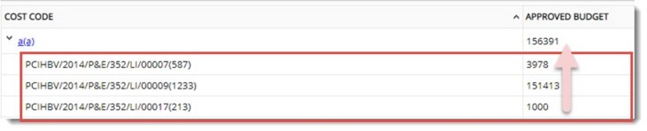 On expanding the cost code, line items and budget defined for the line items are displayed. Total budget amount is displayed in the top of the column.