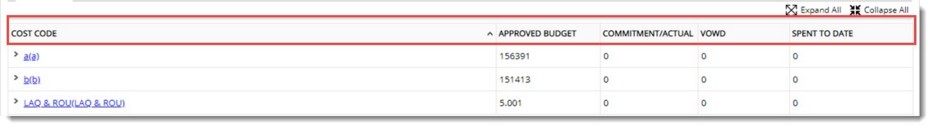 COST CODE: In this column Cost Code and different line items created will be displayed. Line Items will be grouped under respective cost codes. Line items can be viewed by expanding the cost code.