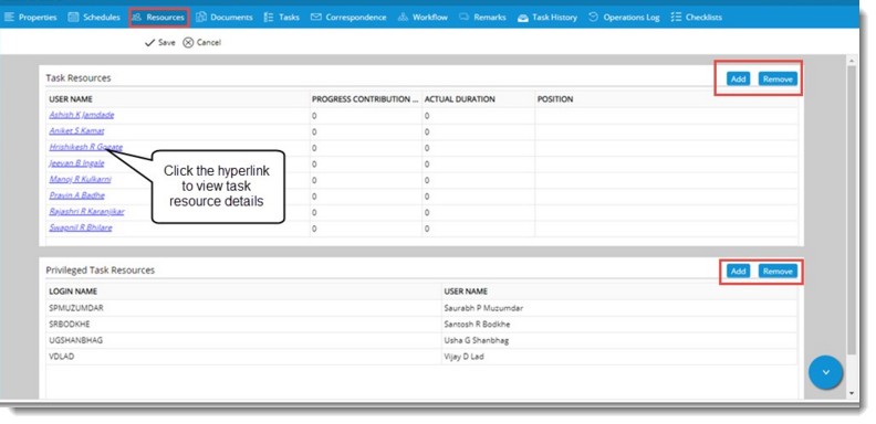 List of selected users are displayed in the grid. On clicking a user name task resource details window is displayed. This window will contain details on Role, Contribution to Project and Actual Duration.