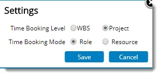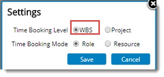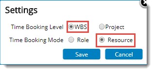 - In the Project, Resource Booking tab, Settings window, select the time booking mode as Resource and Time Booking Level as WBS and click Save button.