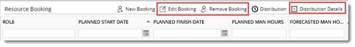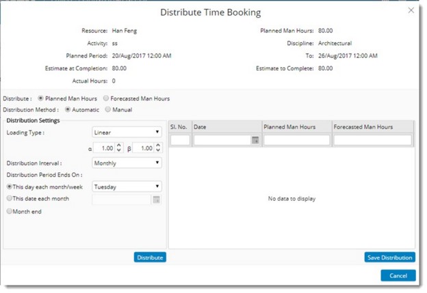 Planned Man Hours or Forecasted Man Hours can be distributed. The distribution can be carried out automatically or manually. Different ways of distributing time booking is described in Project>>Resources>>Resource Booking>>Distributing time booking. Click the link for more details.