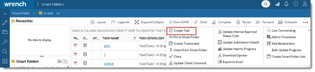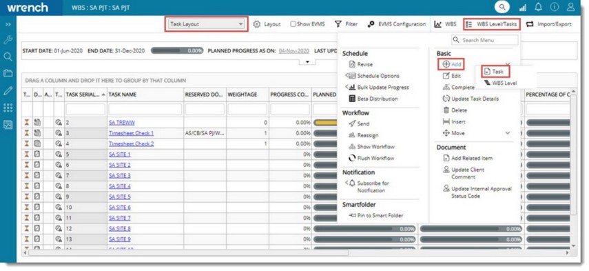 A task can be added from the smart folder handling tasks. Also a task can be created from the WBS. Tasks can be created from WBS Level & Task Layout, Task Layout and Combined Layout.