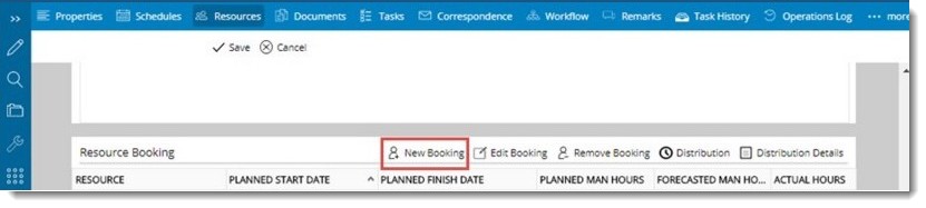 In addition to options for creating a resource booking and distributing the booking, following options are available in the options bar.