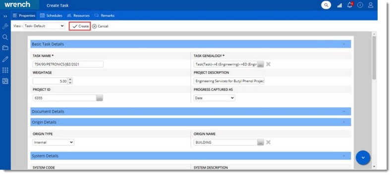 On clicking Create, Task Details window is displayed. For more information on elements in the task details window see Working from Task Details window.