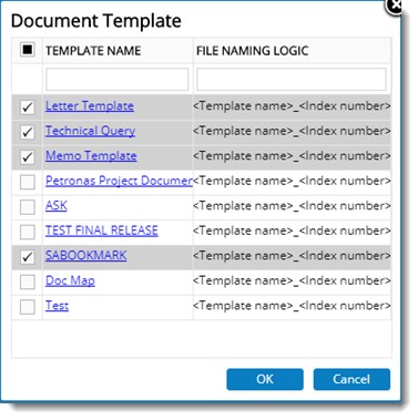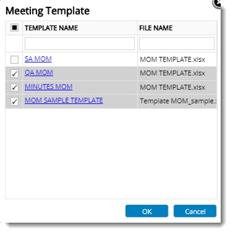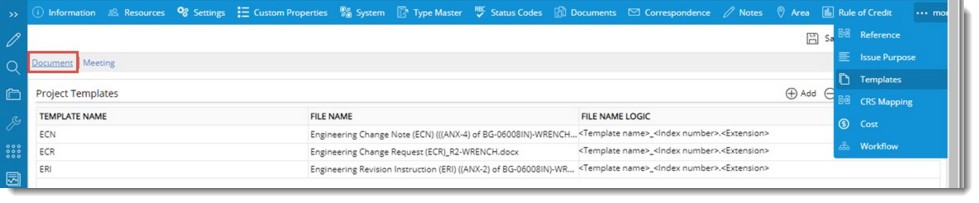A standard format can be created for certain documents and Meetings, and these formats can be used accordingly while adding new documents and meetings. These standard formats are referred to as templates. These formats are saved under different template names. The templates are created in the template master. User can define the templates as project dependent or independent. For project dependant templates the projects can be assigned in the template master. The templates assigned to a project are available with the respective projects.