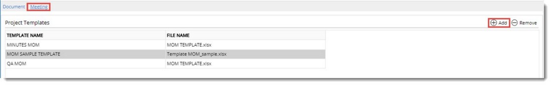On selecting the templates tab, list of document and meeting templates assigned to the project is listed under respective tabs. You can add templates to the project and remove templates assigned to the project.
