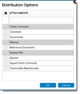 Figure: Distribution Option window You can select from the following options. Documents: On selecting this option document is sent. Comments: On selecting this option comment files are sent. Client Comments: On selecting this option Client Comments of the file are sent. Markup: On selecting this option, Markups attached to the file are sent. Reference Documents: On selecting this option reference documents of the file are also sent. Related File: On selecting this option, related files of the file are sent. Specter: On selecting this option, specter files attached to the file are sent. Squad Check Comments: On selecting this option, specter files attached to the file are sent. Transmittal Attachments: On selecting this option transmittal attachments like report are attached to the transmittal. NOTE: This option will be disabled if the submission type selected is Package. |