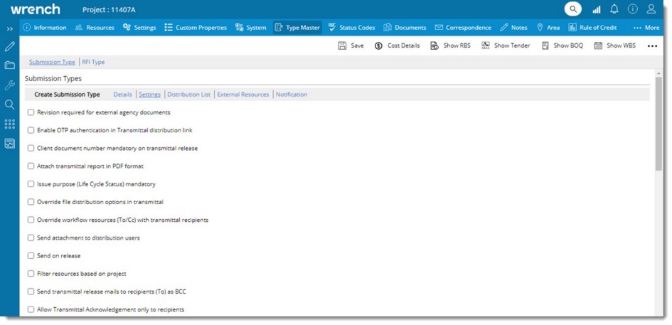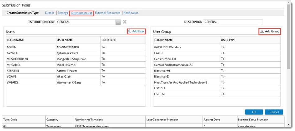 The Distribution list contains the pre-defined list of users or user groups to whom the transmittal or submittal is send. Distribution Codes are created in Wrench Masters; To, Cc users are defined and these codes are assigned to a submission type. They will be inherited into project on selecting a submission type. Users can add additional users to the already assigned distribution. These changes will not be applied back to masters.