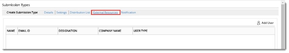 External Resources who are already added to the project can be added to a submission type.