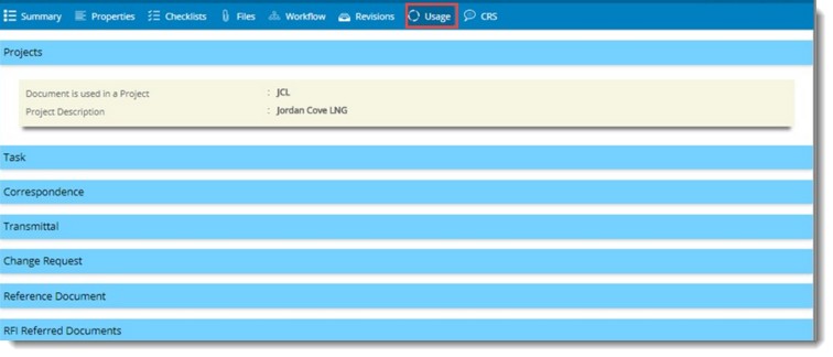 Sometime a document may be used with a Project, Task, Transmittal and Correspondence. On selecting the Usage Information, all these details can be viewed.