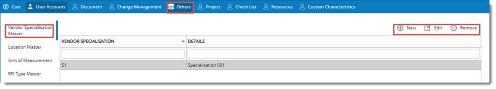 Figure: Vendor Specialisation Master window