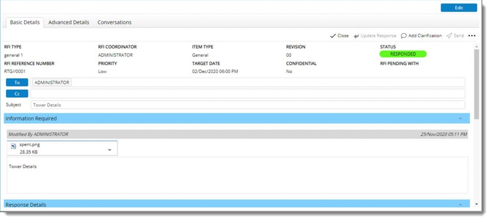 Edit operation can be performed by any users who can access the RFI and has ‘Edit RFI’ permission in the respective project Genealogy.