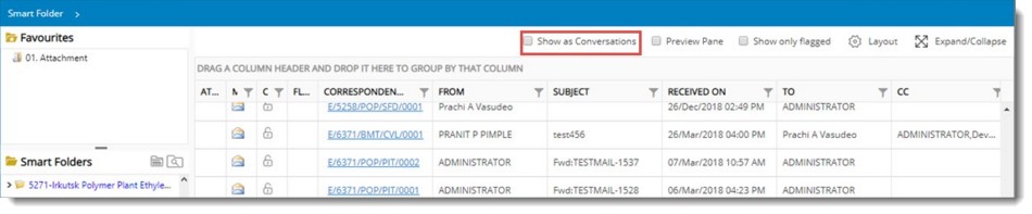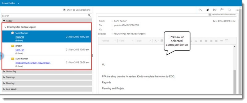 Smart Folder view is collapsed and preview panel is displayed. The correspondences will be grouped under headers based on the date they are sent. By default latest correspondence will appear at the top of the pane. In the left pane preview of the selected correspondence will be displayed.