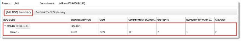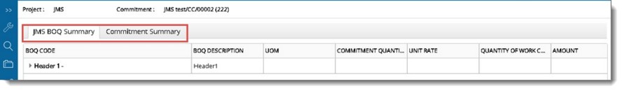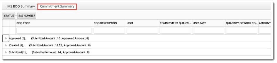 Summary option summarizes the JMS based on BOQ and Commitments.