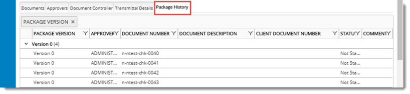 Details of the package and documents in the package are available under the Package History tab. Comments of each approver and status of the document after their review is displayed here.