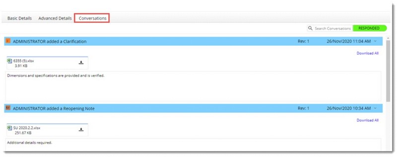 Entire list of conversations related to the RFI is displayed here. All the RFI conversations such as Information Required, clarifications, responses, closing notes and reopening notes will be listed based on the conversation type. The conversations will be sorted based on descending order of the created-on date. The conversations listed will have a header section which will display the Conversation Type, Creator Name, RFI Revision number and the conversation created on date as displayed in figure above. The conversation attachments and conversation notes will also be displayed. When the conversation tab is selected all the conversation details will be in expanded state by default. The conversation details can be collapsed by clicking on the header portion of each conversation.