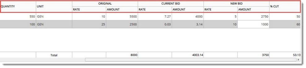 Bid rate can be entered manually in the column RATE, in the ‘NEW BID section. When the rate is entered, Amount’ is automatically calculated and displayed. The sum of Amount is displayed in the column ‘Total. Amount can be entered directly in the column highlighted in yellow background. Once new bid rates are entered ‘%Cut’ is calculated by the system and is displayed in the respective cell. % cut is the % of reduction between the original amount and the current amount.