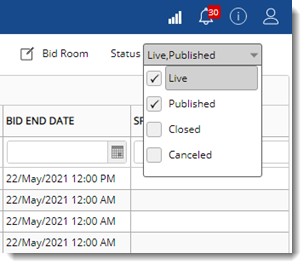 Reverse Bidding Sessions which are published to the logged in User or vendor by default. The Reverse Bidding Sessions will be sorted based on Status; sort order as Live, Published, Closed and then Cancelled, each sorted again by their bid dates. Only the reverse bidding sessions in Live and Published status will be displayed by default in the window. Reverse bidding sessions in other statuses can be viewed using the status filter in the top right corner of the window. Required status can be selected from a drop-down list as shown in the following figure.