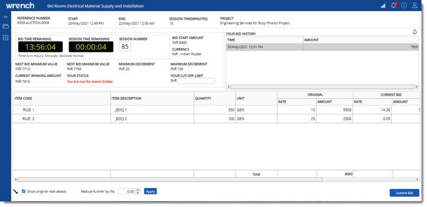 Bid details of the selected line item are displayed in the ‘Bid room details window. Values save against the Reverse Bid is displayed in the header details. If any bidding history is available against the logged in vendor for the selected tender, the details will be displayed in the section Your Bid History.